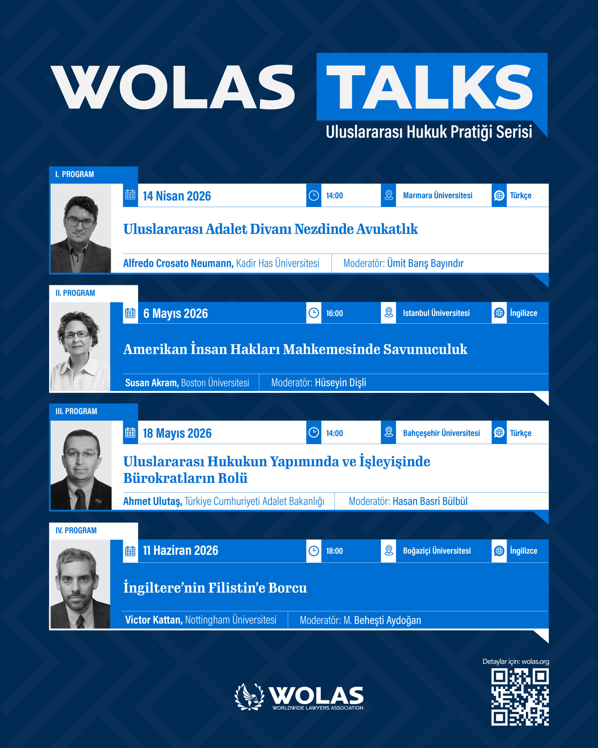 Wolas Talks Uluslararası Hukuk Pratiği Serisi, insan hakları hukuku ve savunuculuk alanında dünya genelinde öne çıkan isimleri Türkiye’nin önde gelen üniversitelerindeki öğrencilerle buluşturan, hem Türkçe hem İngilizce gerçekleştirilecek çok ayaklı bir söyleşi serisidir. Her oturumu, alanında deneyimli bir moderatör tarafından yönetilen serinin ilk ayağı; Bahçeşehir Üniversitesi, Marmara Üniversitesi, İstanbul Üniversitesi ve Boğaziçi Üniversitesi’nde gerçekleştirilecektir.